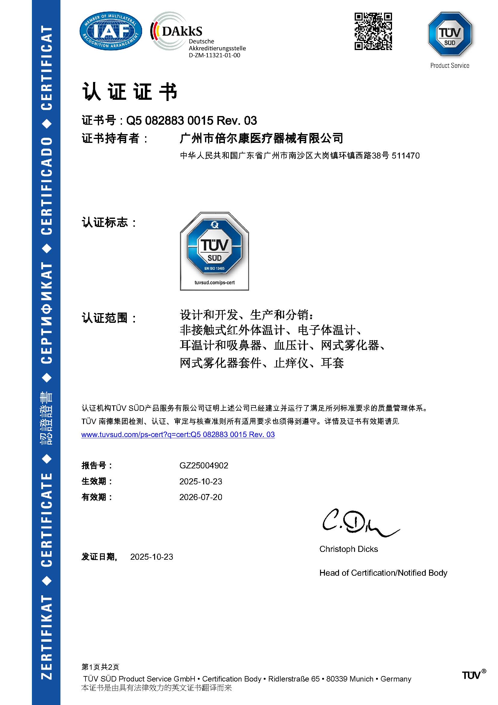 公司秉承“質量第一、創新驅動”的發展理念,擁有智能化生產線和嚴格的質量管理體系,產品通過ISO 13485、CE、FDA等國際權威認證,擁有多項國家技術專利,并獲評“廣東省醫用紅外體溫測量工程技術研究中心”。在呼吸治療領域,倍爾康依托成熟的技術平臺與醫療級品控體系,推出專業霧化器產品,致力于為醫院及家庭用戶提供高效、安全、穩定的霧化治療解決方案,廣泛適用于兒科、呼吸科及家庭康復等多個場景。