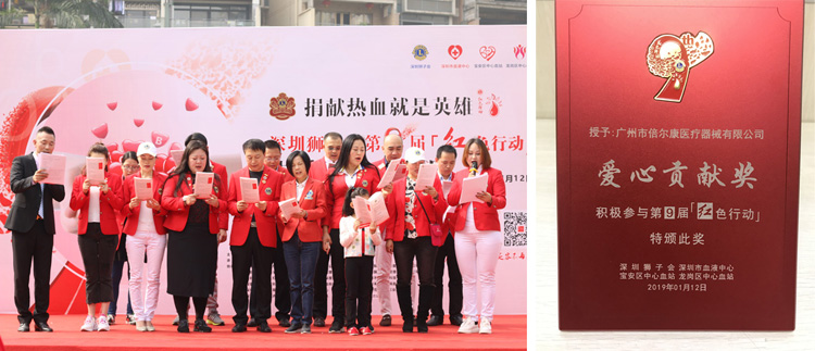 2019年1月12日,聯手深圳獅子會在深圳龍華區民治春華四季園舉行了第九屆“紅色行動”給每一位成功獻血的朋友送出倍爾康額溫計,并榮獲了“愛心貢獻獎”。