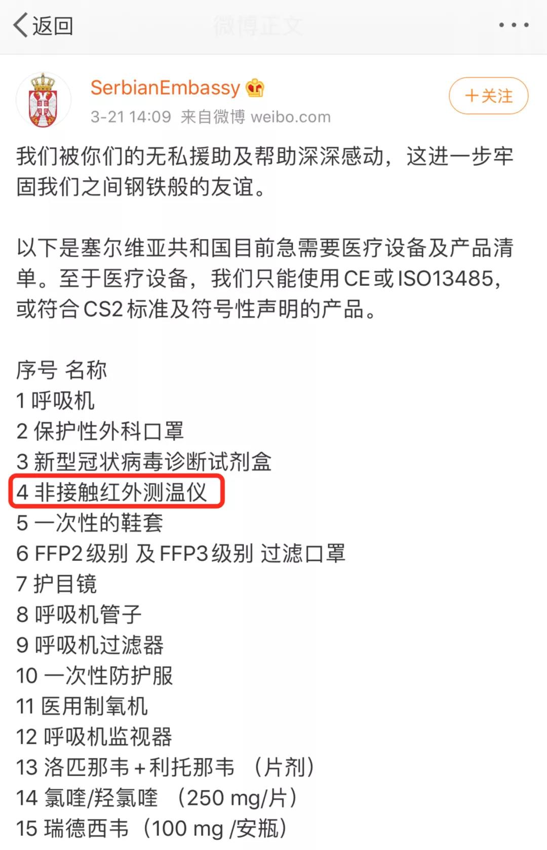 大概是感受到了中國人民的如火熱情,3月18日,塞爾維亞駐華大使館開通了官方微博。幾天后,也就是21日,他們發布了急需物資的清單: