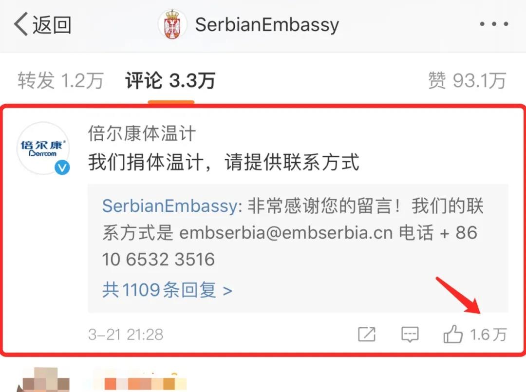 當小倍看到里面的物資列著“非接觸式紅外體溫計”時,迅速留言表示了捐贈意向,隨即收到大使館的回復以及網友的1.6萬個贊。