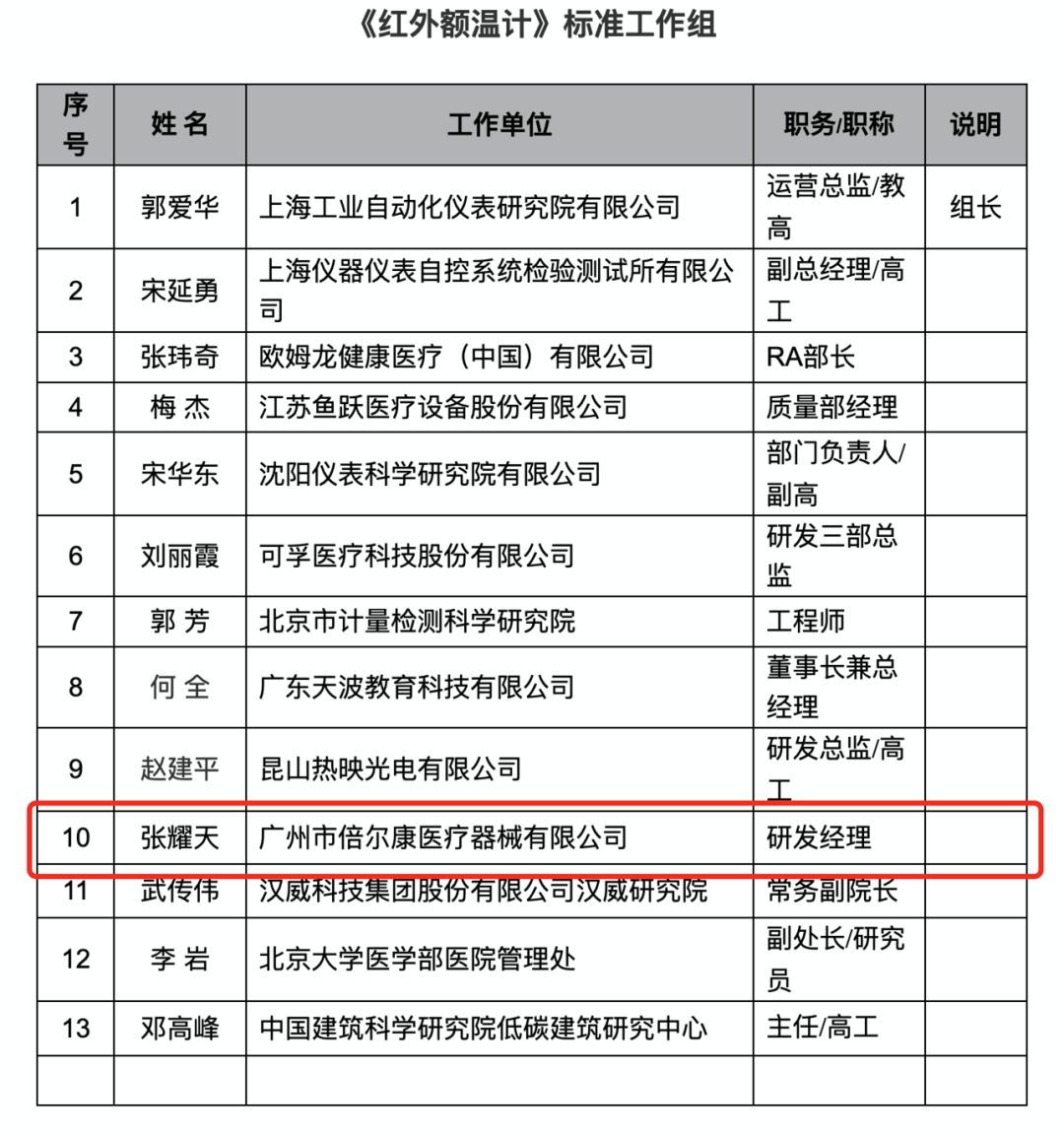 早在今年的4月份,中國儀器儀表學(xué)會為滿足市場的需要,規(guī)范產(chǎn)品的技術(shù)要求、測量準(zhǔn)確度、可靠性等質(zhì)量要求,規(guī)范一致的試驗方法,用標(biāo)準(zhǔn)促進(jìn)紅外額溫計產(chǎn)品在整體質(zhì)量和性能上的全面提升等成立了紅外額溫計標(biāo)準(zhǔn)制定工作組,倍爾康的研發(fā)經(jīng)理張耀天作為行業(yè)代表參與了這項工作。