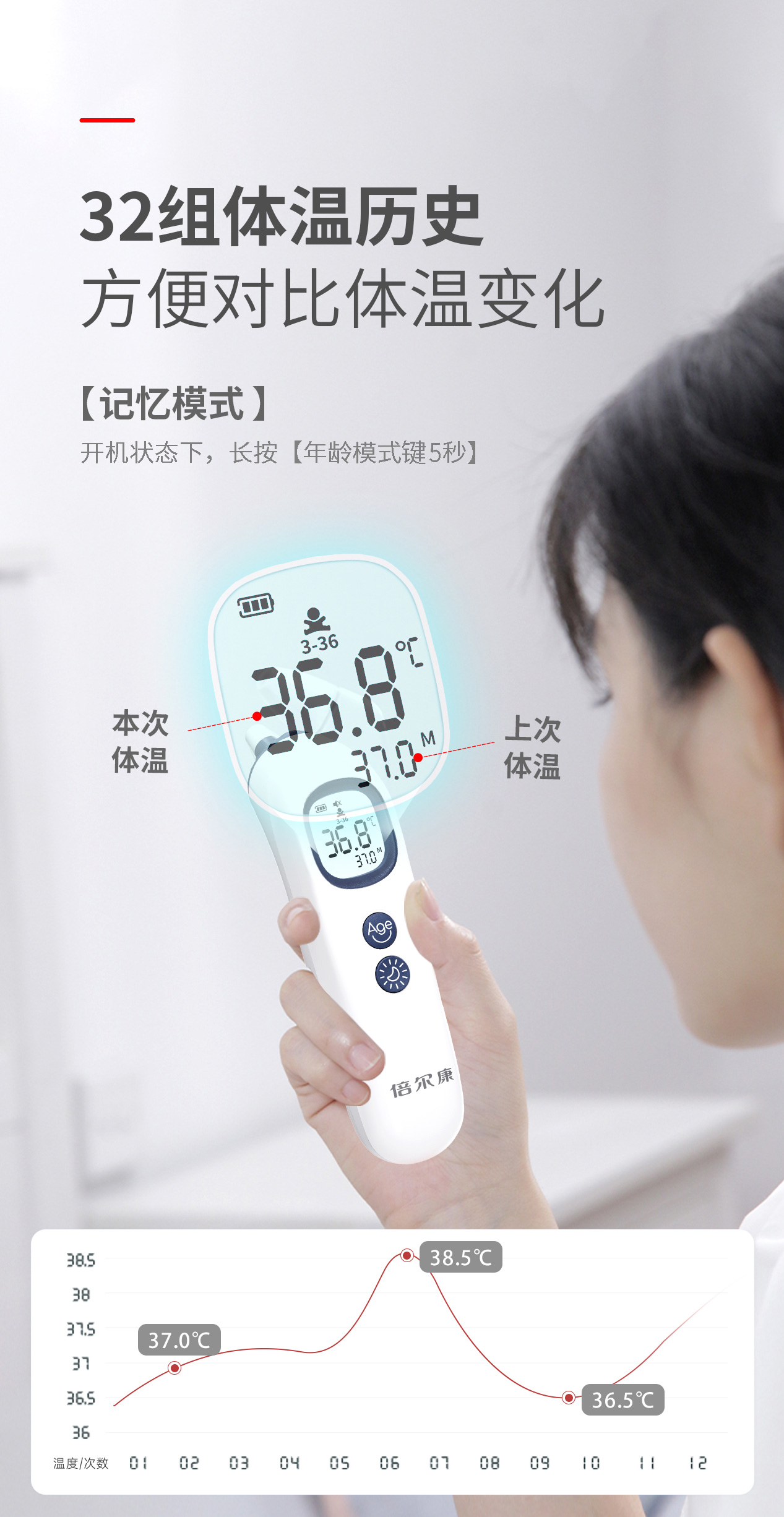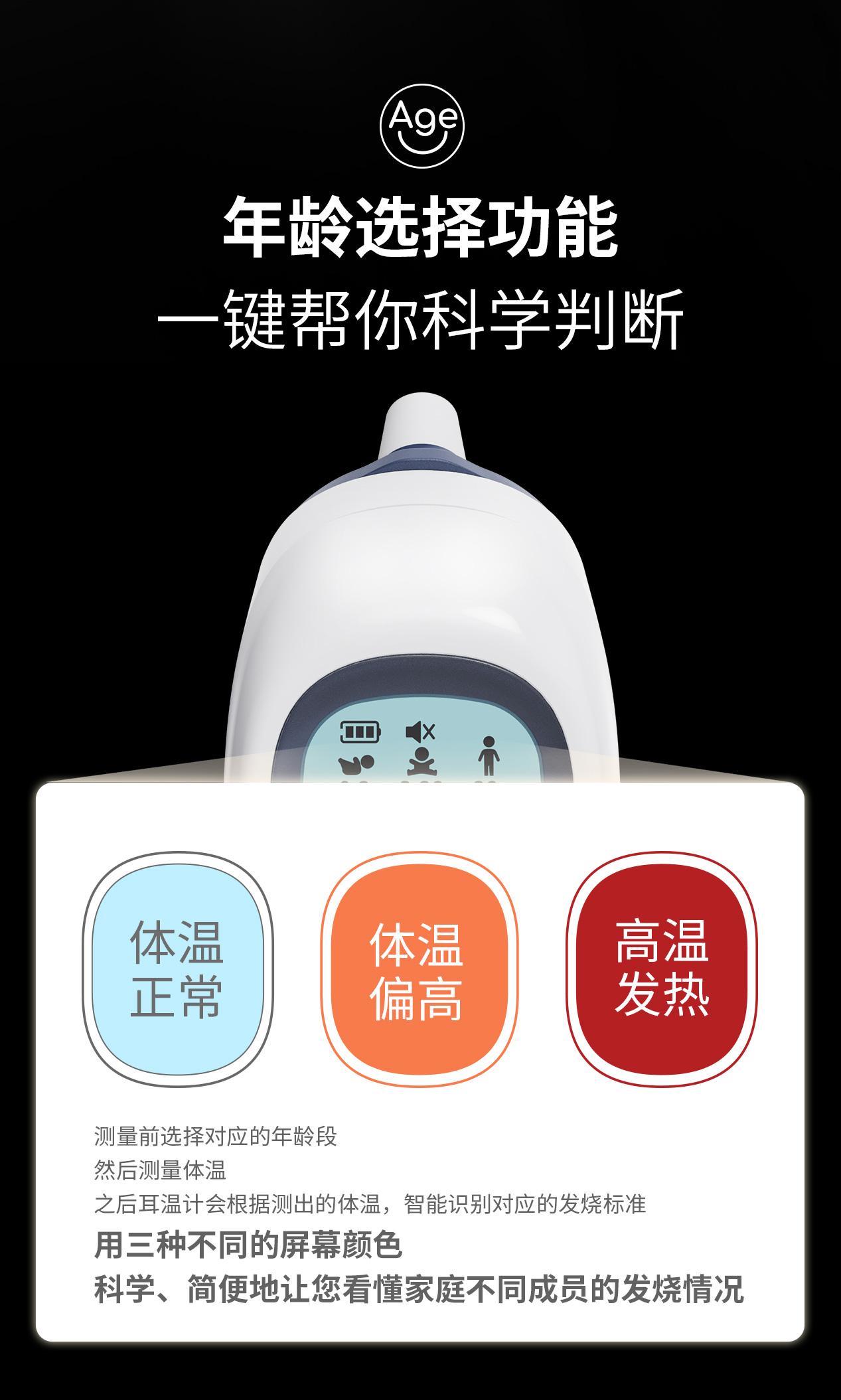 年齡段選擇:可選擇受測(cè)對(duì)象不同年齡測(cè)溫模式